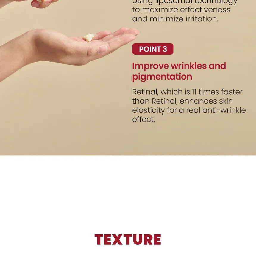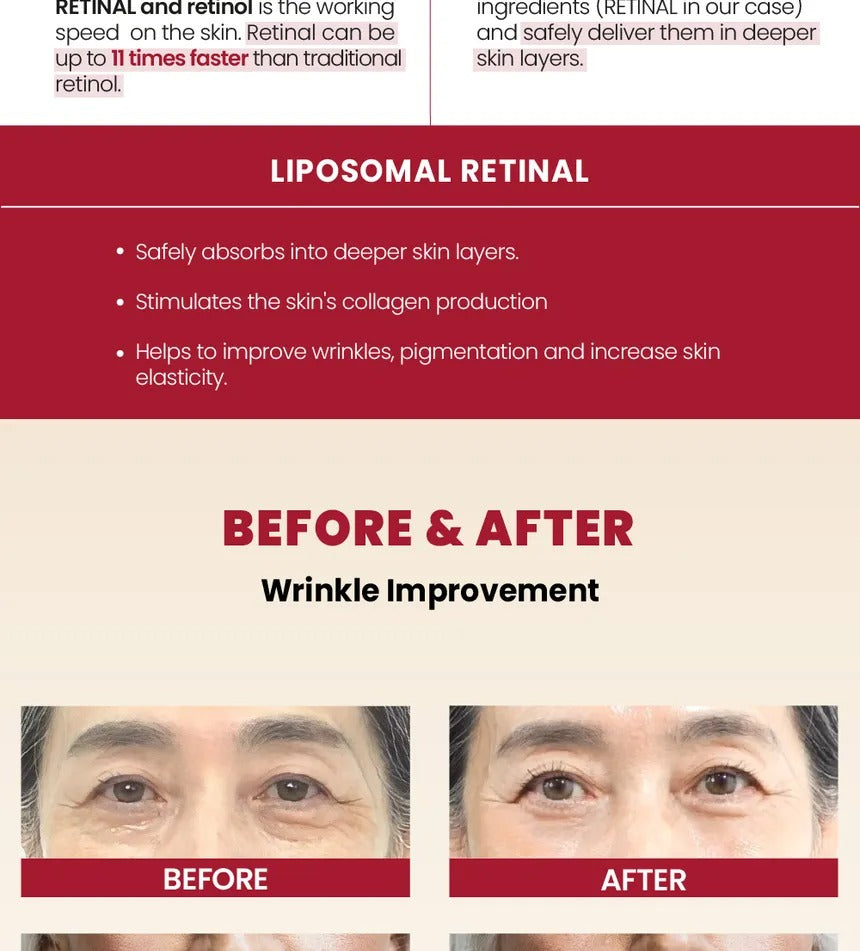 Retinal, Bakuchial, and Peptides target Wrinkles and Pigmentation. Boosts Collagen for Plump, Even-toned skin, potent and beginer safe.