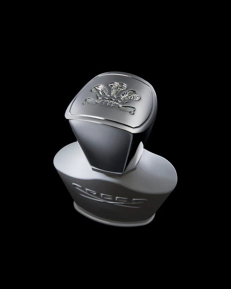 The bottle is a sleek white rectangular vessel with a polished silver cap, embossed with the iconic Creed crossed swords and a regal crest. The minimalist design highlights the “Silver Mountain Water” inscription, reflecting the perfume’s enduring, luminous notes that linger gracefully on the skin for hours.